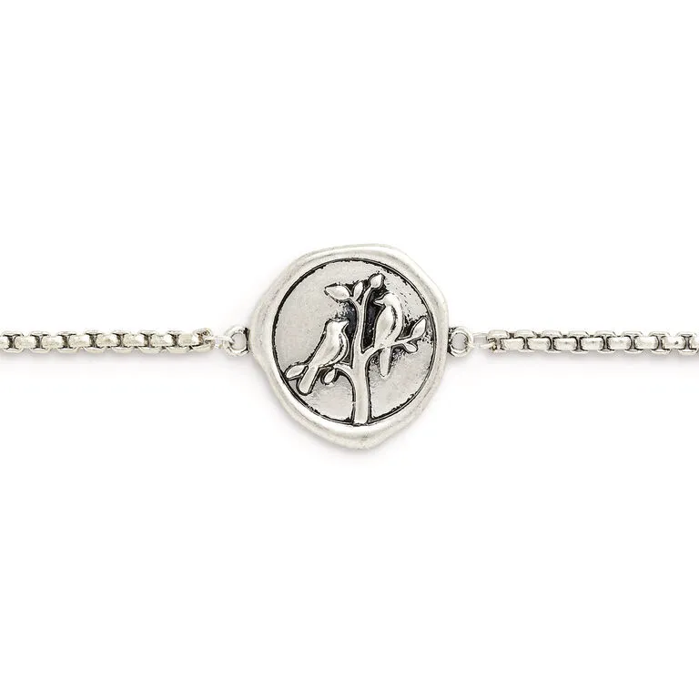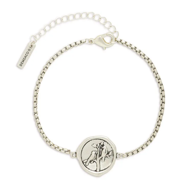 - Demdaco silver-finished brass bracelet features charm with two birds on a branch design.