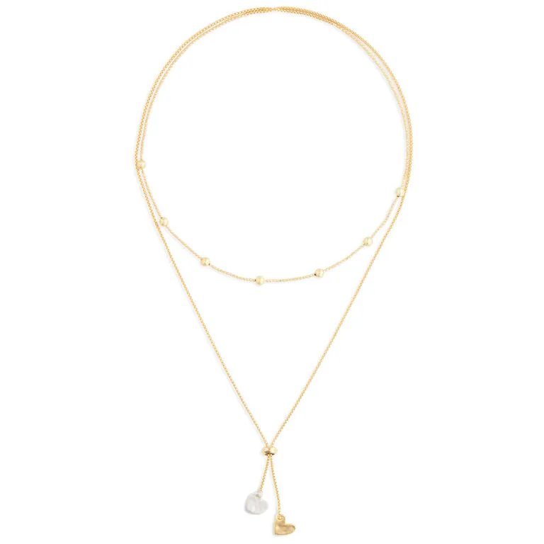 - Layered necklace made of brass and other metal materials features a pair of heart charms.
