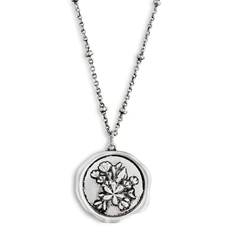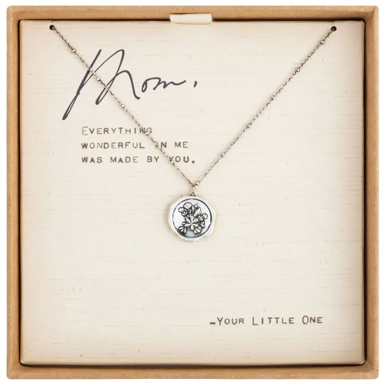 An embossed flower design in textured silver finish conveys a message of love and gratitude to a mom who has been the rock of sustenance for her child. With a round, floral charm that resembles a wax letter seal and an adjustable-length chain, this necklace gives your mother a wearable reminder of how much you treasure her. Gift-box packaging includes a letter-style message to mom, signed by her loving child.