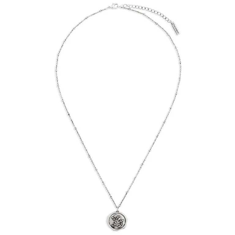 - Silver-finished brass necklace features charm with floral design.