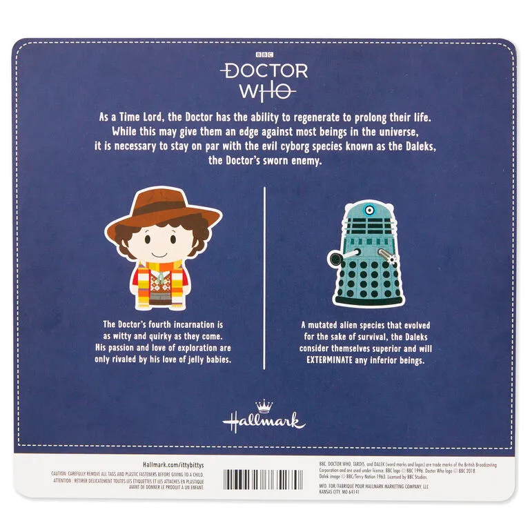 - itty bittys Doctor Who plush set includes 2 characters crafted from soft fabric: The Fourth Doctor and a Dalek.