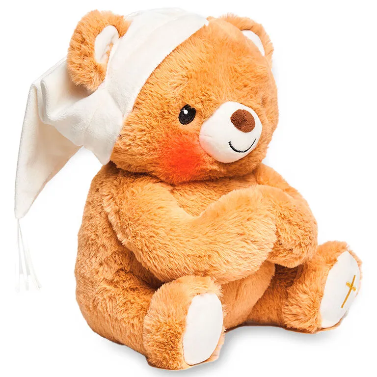 Surprise your children with a cuddly prayer buddy. This soft, adorable little Paws for Prayer Bear is ready for bedtime prayers with a cream-colored nightcap and an embroidered gold cross on its foot. When its paws are put together, the musical bear’s cheeks light up a rosy red and it plays “He’s Got the Whole World in His Hands.”
