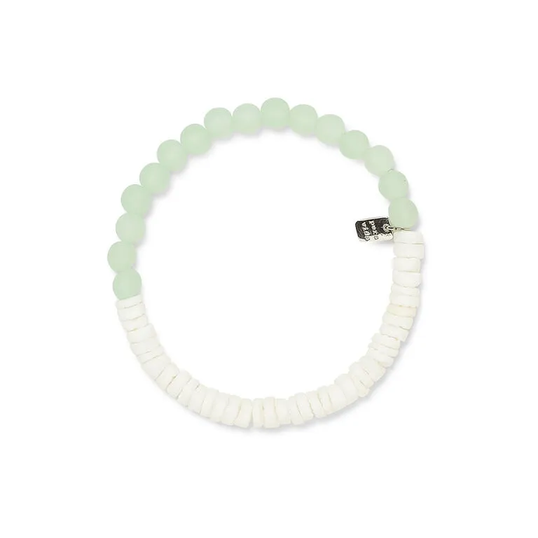 Take your surf style to the next level with a beach-ready accessory. The beaded bracelet is strung on a durable stretch elastic cord which makes it easy to slip on and off your wrist depending upon your activity. Half of the bracelet features mint acrylic frosted beads while the other half is raw natural puka shells. Makes a great gift for her birthday, Mother’s Day or just because.