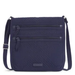Show off your mad organization skills with this clever crossbody purse that boasts three separate zippered compartments. This Vera Bradley hipster bag in a navy blue quilted microfiber fabric features exterior and interior zip and slip pockets galore for secure but easy access to your essentials. Its adjustable strap offers functional style, and the soft cotton construction means that it’s lightweight and packable.